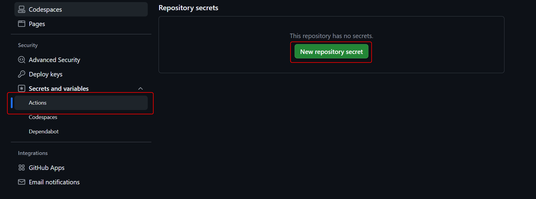 クリックしたら、サイドメニューからSecrets and variablesをクリックし、Actionsを選択します。