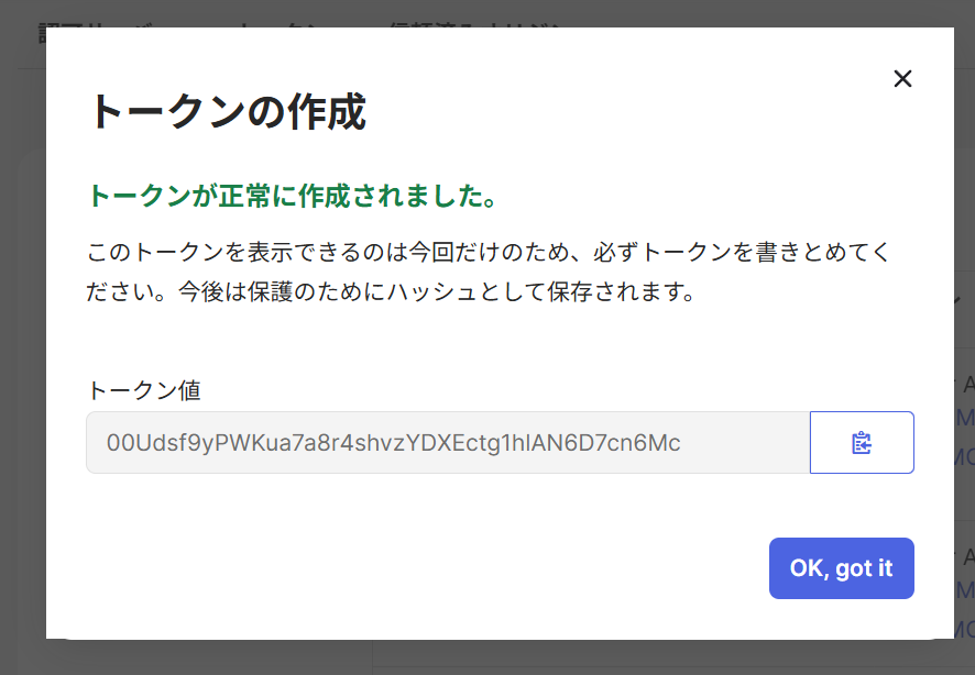 最終的に以下のようなトークンが生成されたら、その値を控えておきます。