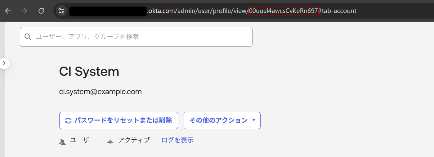 - USER_ID:Oktaの管理画面でディレクトリ→ユーザーから、先ほど作成したユーザーの詳細画面にアクセスし、URL末尾の文字列を設定(以下画像の赤枠部分)